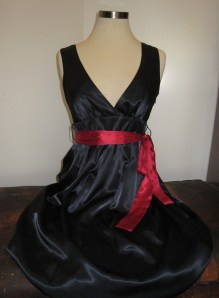 Anyway, I do like the dress, but I’m not sure that I love it. It’s just a cheap dress that looks good from far away, but up close you can tell the quality just isn’t there. The loops for the ribbon belt, for example, are ridiculously large. If I felt like it, I could slide my hand through one and wear the whole dress as a bracelet. But it is a pretty dress… I just can’t decide.