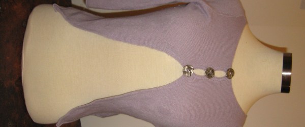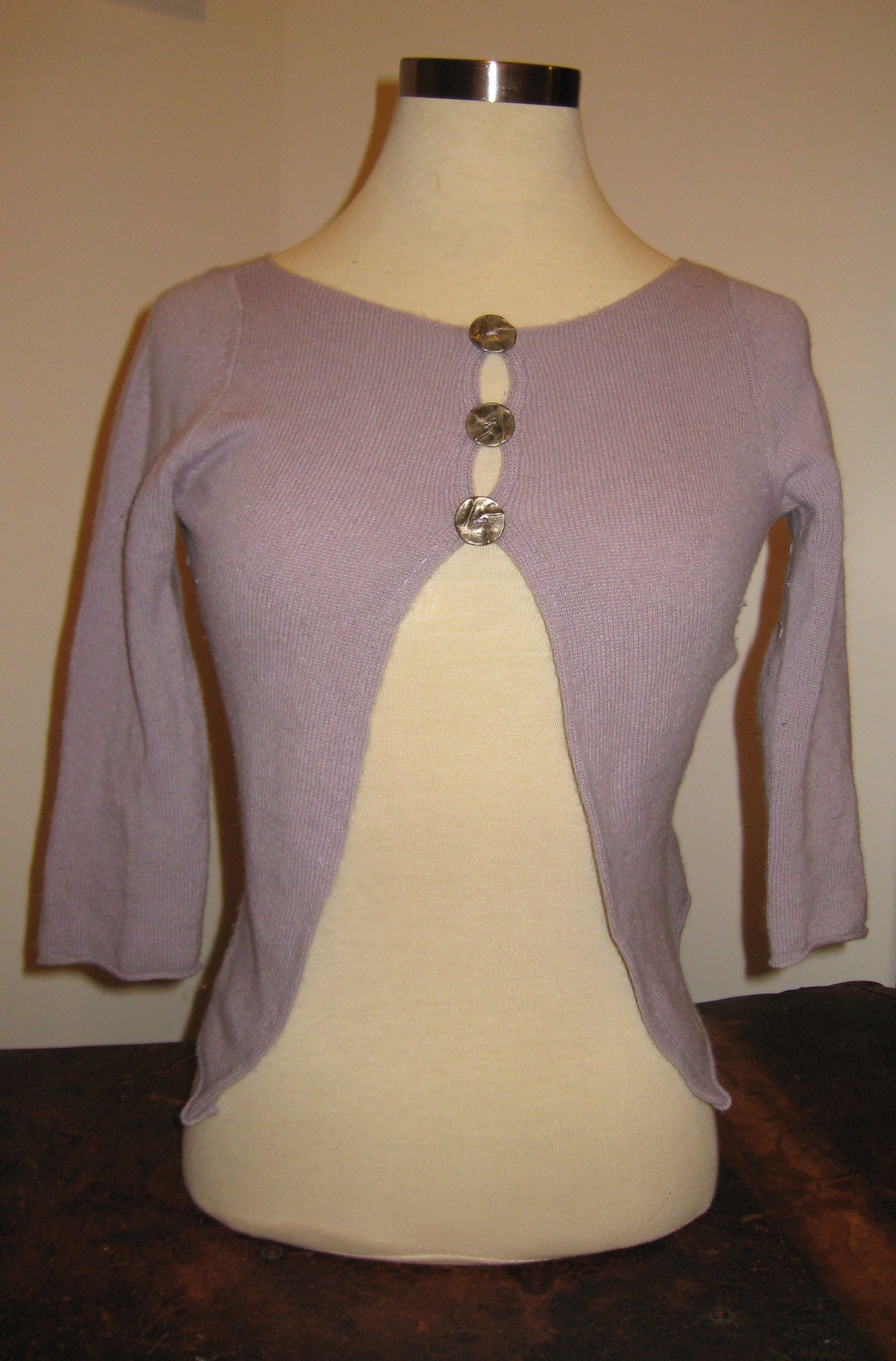 Item: Sweater Color/Fabric: Lavender, cashmere Designer: Express Where Purchased: Value City (tears) Years Owned: 10?