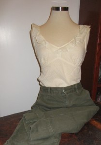Item: Capris Color/Fabric: Olive, cotton Designer: Roxy Where Purchased: Pacific Sun Wear (!) Years Owned: 12?