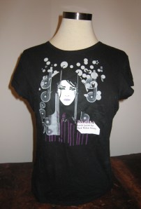 It’s funny, I work at a thrift store, and this shirt came in today. I could not stop looking at it, and I even wrote “Sarula Black Widow Honey” on my hand so that I could look it up. From my image search… I think she is either a singer, or a stripper… I can’t tell. Lol. Nether the less, I wish I was teeny weenie so I could buy the shirt myself and wear it XD it’s definitely a keeper.