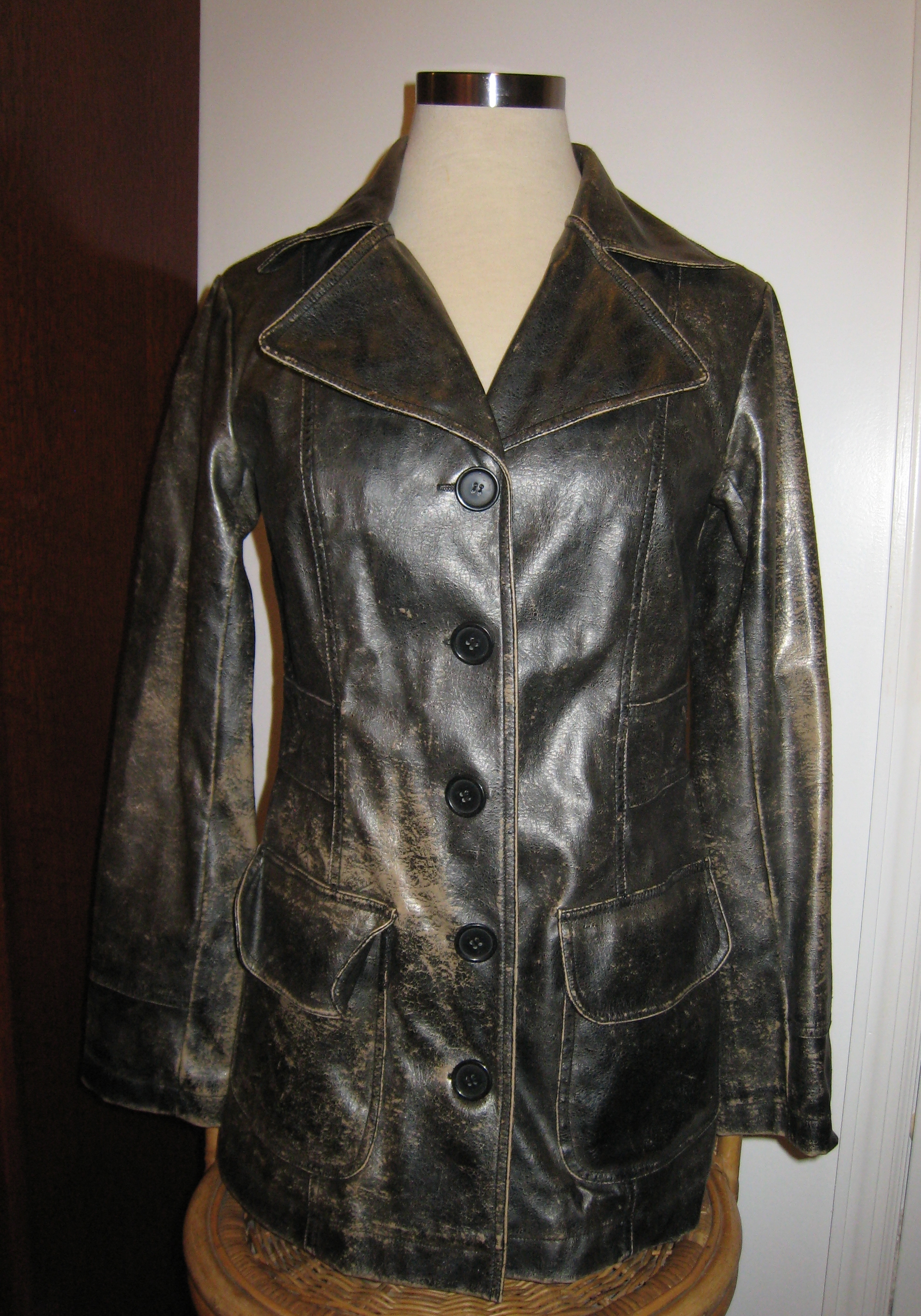 Item: Jacket Color/Fabric: Blackish, pleather Designer: Wet Seal Where Purchased: A gift from my sister Years Owned: ??? Possibly over ten?