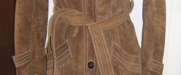 Item: Coat Color/Fabric: Tan, suede Designer: ?? Where Purchased: A Thrift store, unknown Years Owned: At least 10