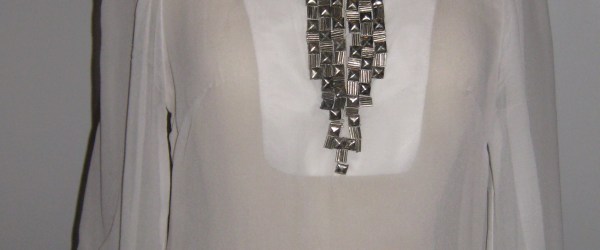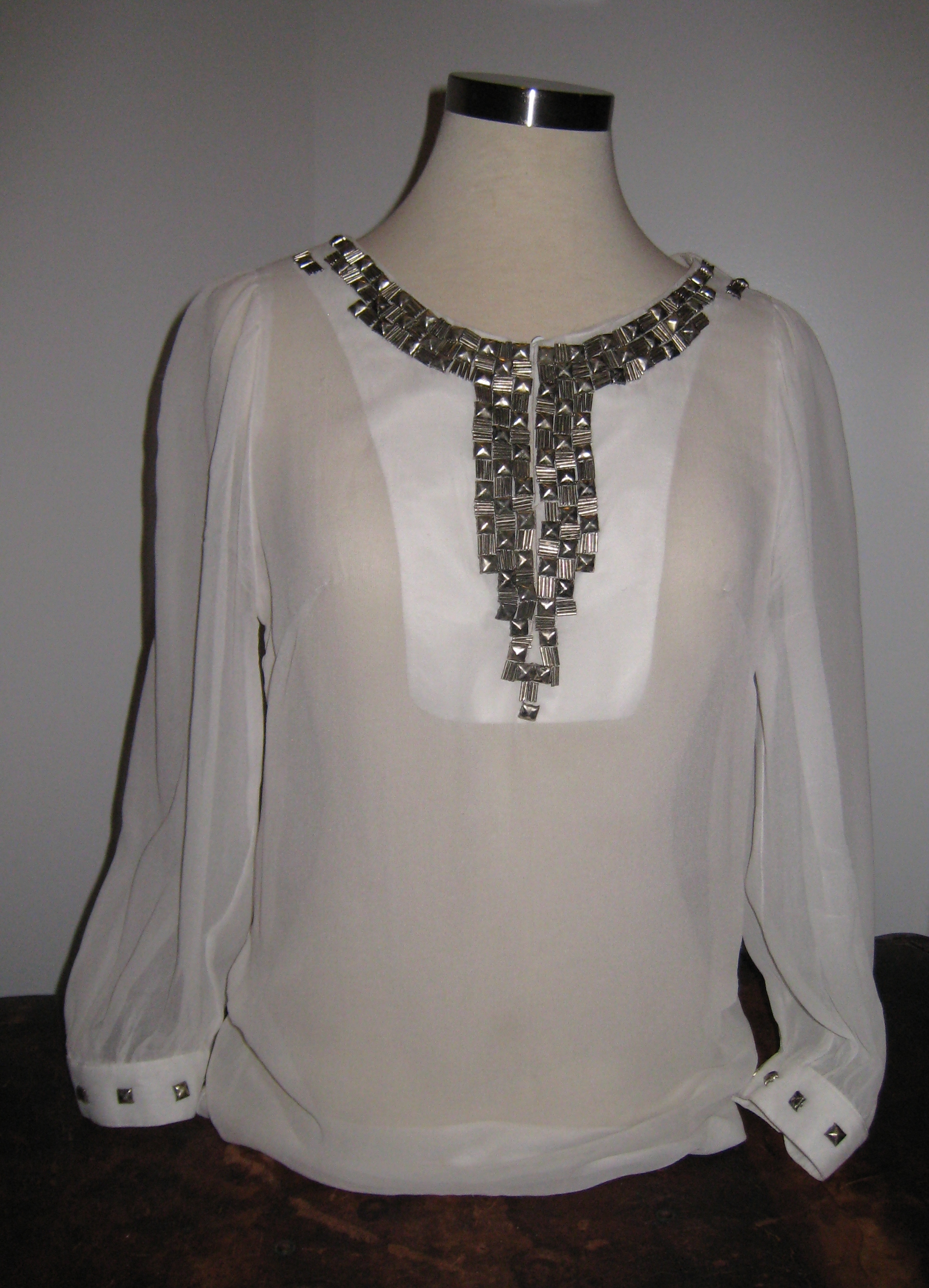Item: Blouse Color/Fabric: Cream/silver, silk/metal Designer: Hannah Jo Where Purchased: Next Boutique Years Owned: Less Than One