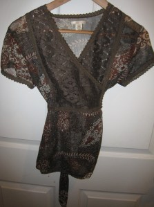 For many years, this was one of my few “fancy” shirts. It was saved for special occasions. I once wore it to a party with a denim skirt that I’ve since worn to shreds, and I felt quite fabulous. It was a party with many of my fellow La Senorita employees. My manager Rob, who was a very close friend that I miss, had a saying that he was fond of and I should have listened to. It went something like “Managers should avoid fraternizing with their employees!” The night ended with tears, some vomit, and the realization that I was ready to move on from MSU’s party scene.