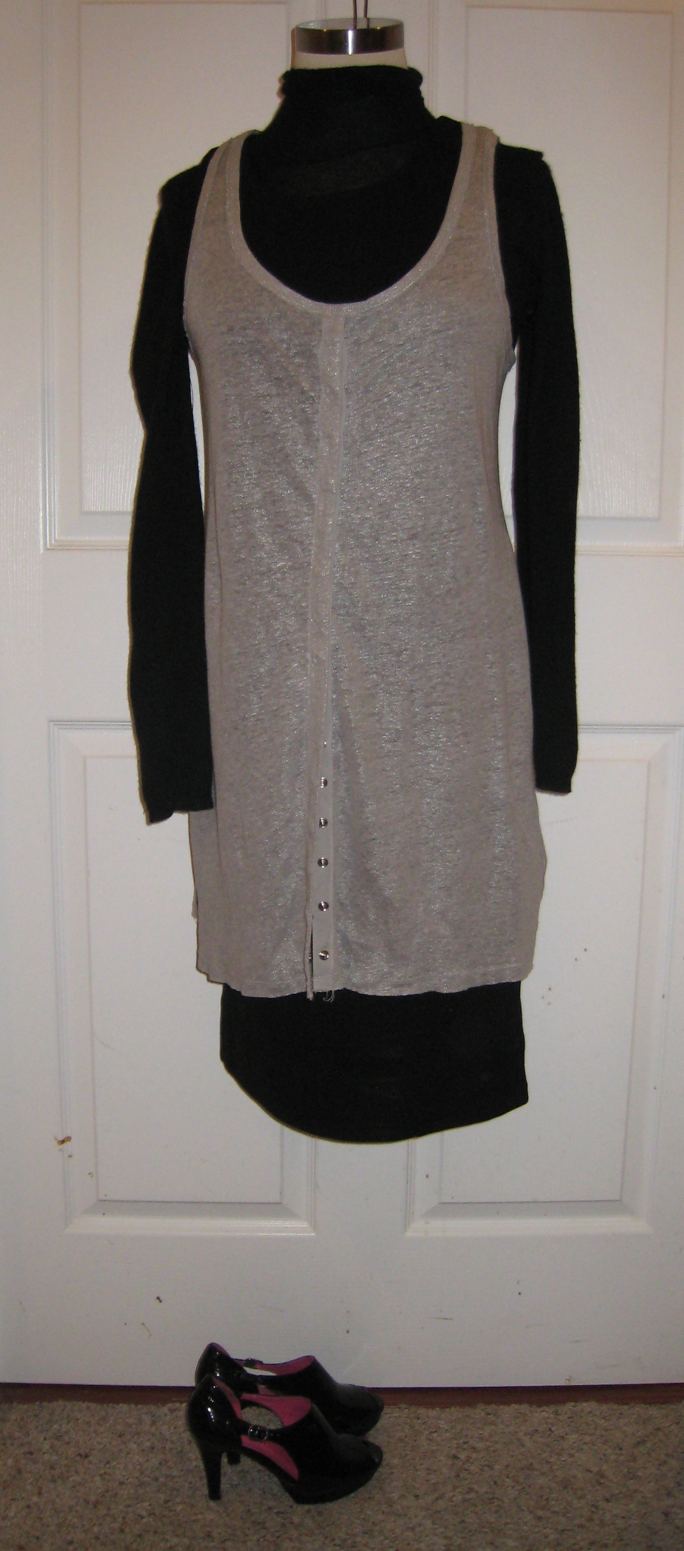 Just after Christmas, I planned to wear it for a little dinner party with a few friends. But I wasn’t able to go home between work and dinner, and had to rely on Nate to gather clothes to change into. “There’s a silver, shimmery longish vest-like tank,” I told him. “Do you see it?”
